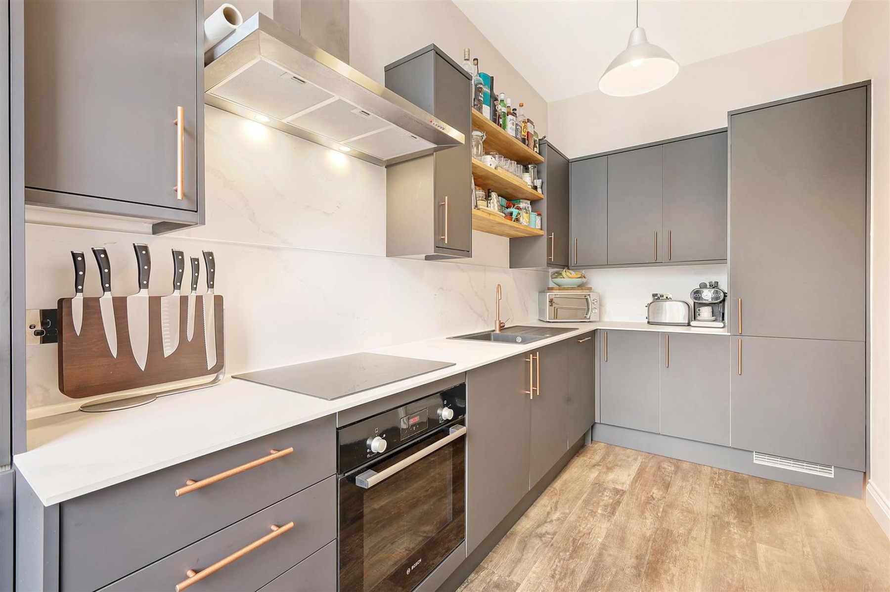 The spacious living room features high ceilings, a striking feature fireplace, and large sash windows, allowing natural light to fill the space. The room opens onto a stylish kitchen, fully equipped with integrated appliances, a breakfast bar, and premium finishes. The well-sized bedroom provides ample storage space and offers access to an unofficial terrace. A tastefully designed shower room complements the apartment’s bright and airy feel.